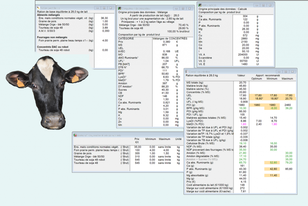 - Pour les vaches laitières, les particularités de calcul des rations complètes, semi-complètes, au pâturage…